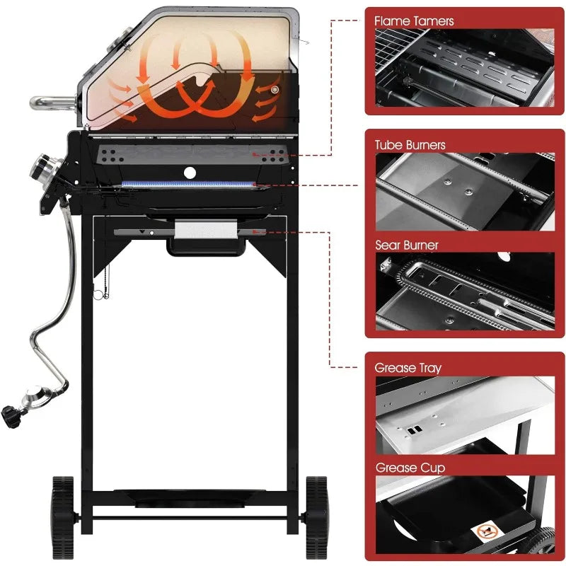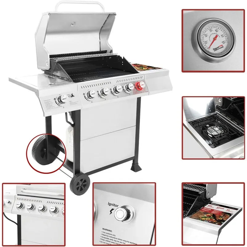 - High Performance: This propane gas grill has 4 main burners (10,000 BTU each), a sear burner (14,000 BTU) and a lidded side burner (10,000 BTU). 6 stainless steel burners offer a total of 64,000 BTU output for delivering even heat.